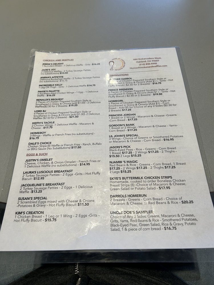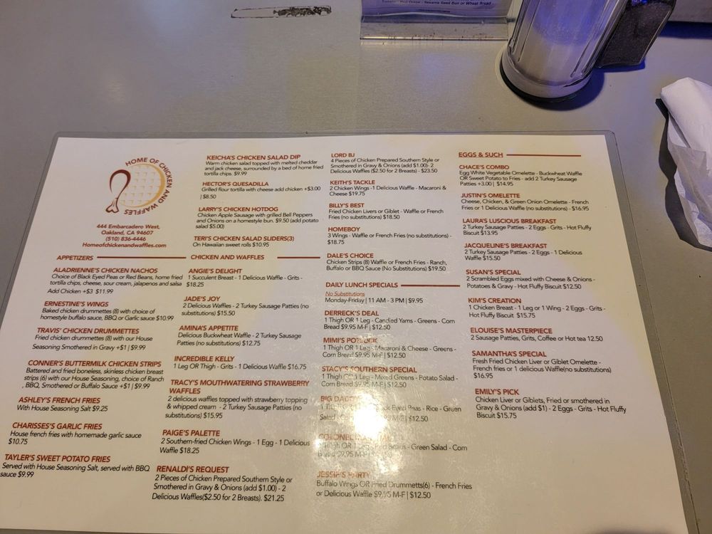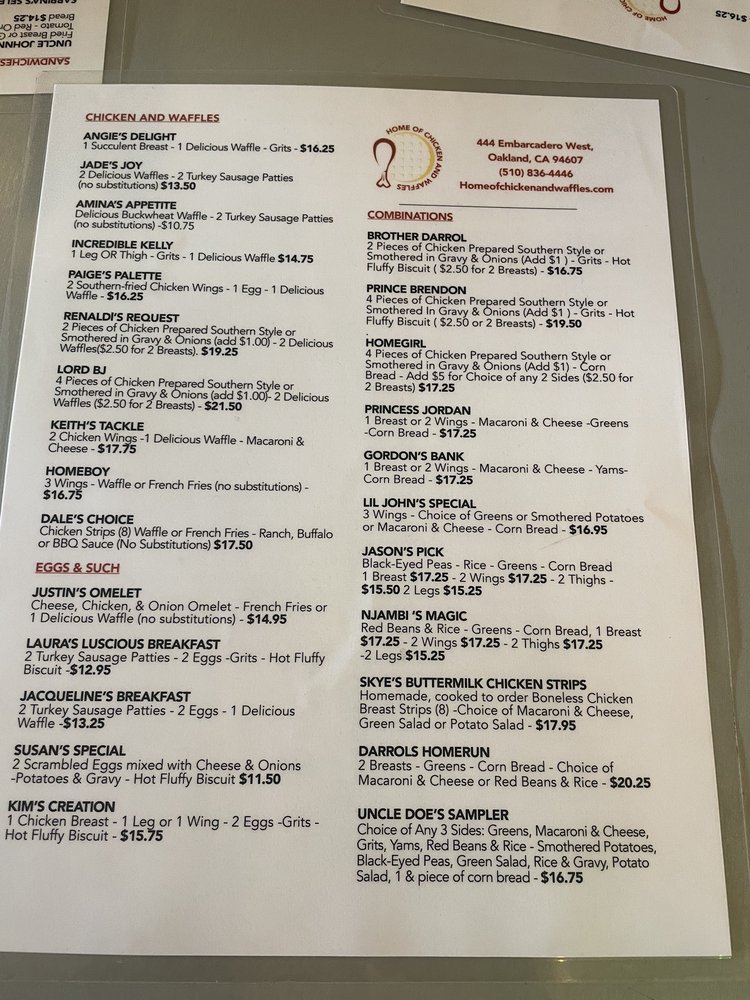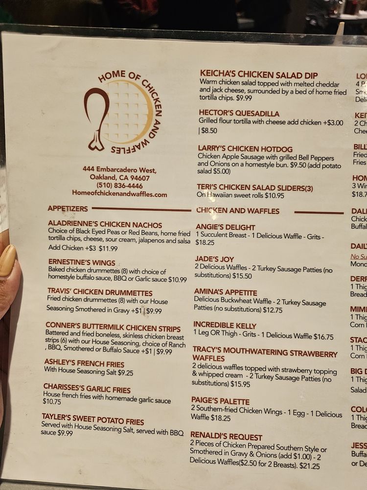 "Introducing the menu at Home of Chicken and Waffles, located in Oakland, CA. This casual dining spot offers a range of options, including appetizers like Aladrienne Chicken Nachos and Ernestine's Wings. But the star of the show is the Chicken and Waffles section, featuring unique combinations like Angie's Delight and Renaldi's Request. If you're feeling adventurous, try out the Special Creative Combinations, such as Skye's Buttermilk Chicken Strips or Princess Jordan. Customers rave about the generous portions, fair prices, and attentive staff at this family-run establishment. With a full bar, happy hour specials, and comfortable seating options, Home of Chicken and Waffles is a must-visit for anyone craving soul food with a twist."