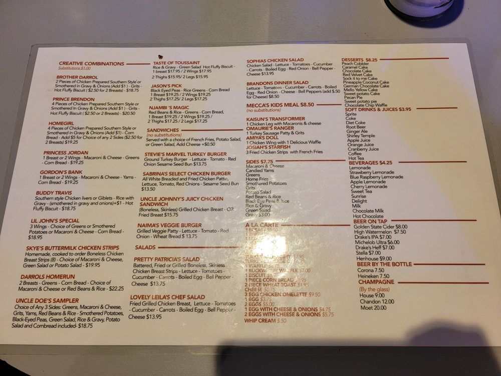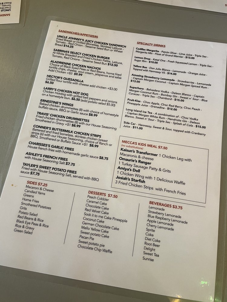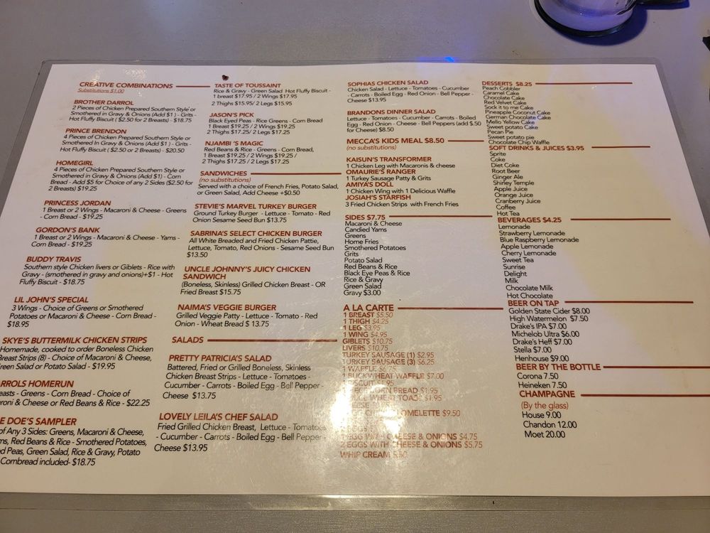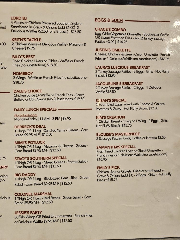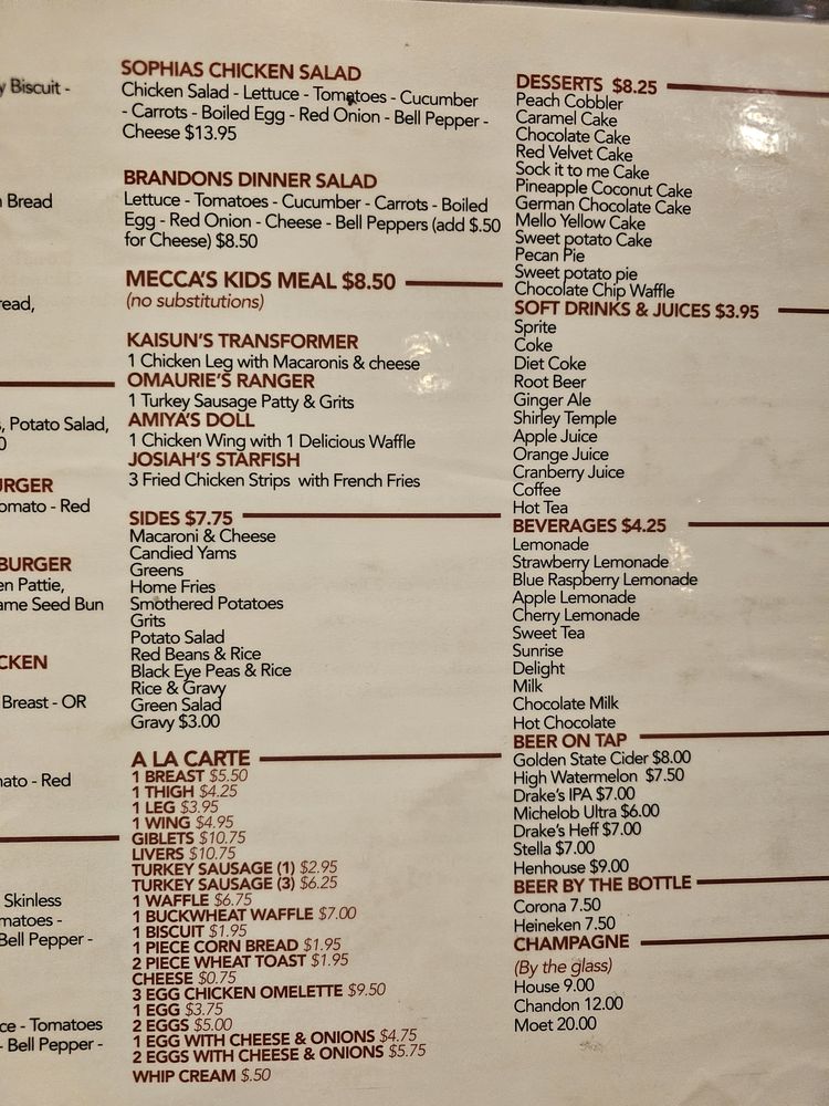 "Introducing the menu at Home of Chicken and Waffles, located in Oakland, CA. This casual dining spot offers a range of options, including appetizers like Aladrienne Chicken Nachos and Ernestine's Wings. But the star of the show is the Chicken and Waffles section, featuring unique combinations like Angie's Delight and Renaldi's Request. If you're feeling adventurous, try out the Special Creative Combinations, such as Skye's Buttermilk Chicken Strips or Princess Jordan. Customers rave about the generous portions, fair prices, and attentive staff at this family-run establishment. With a full bar, happy hour specials, and comfortable seating options, Home of Chicken and Waffles is a must-visit for anyone craving soul food with a twist."