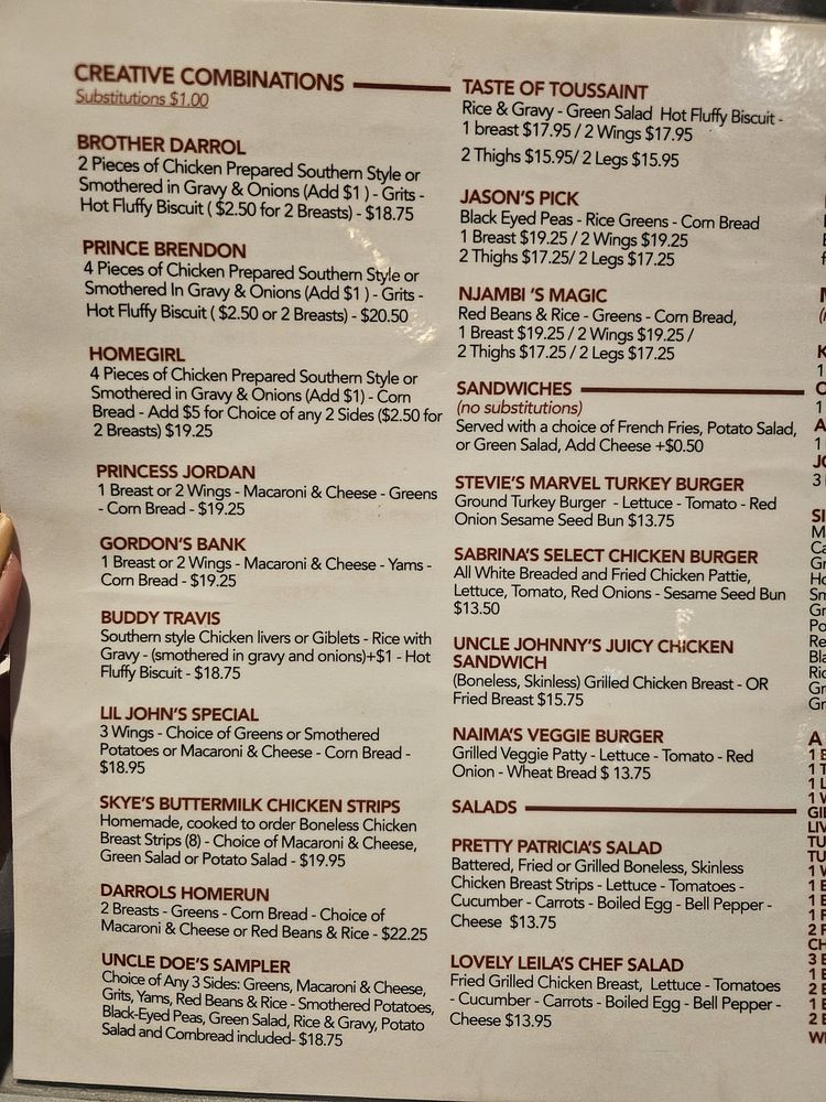 1 thigh or 1 leg, mixed greens, potato salad and cornbread.